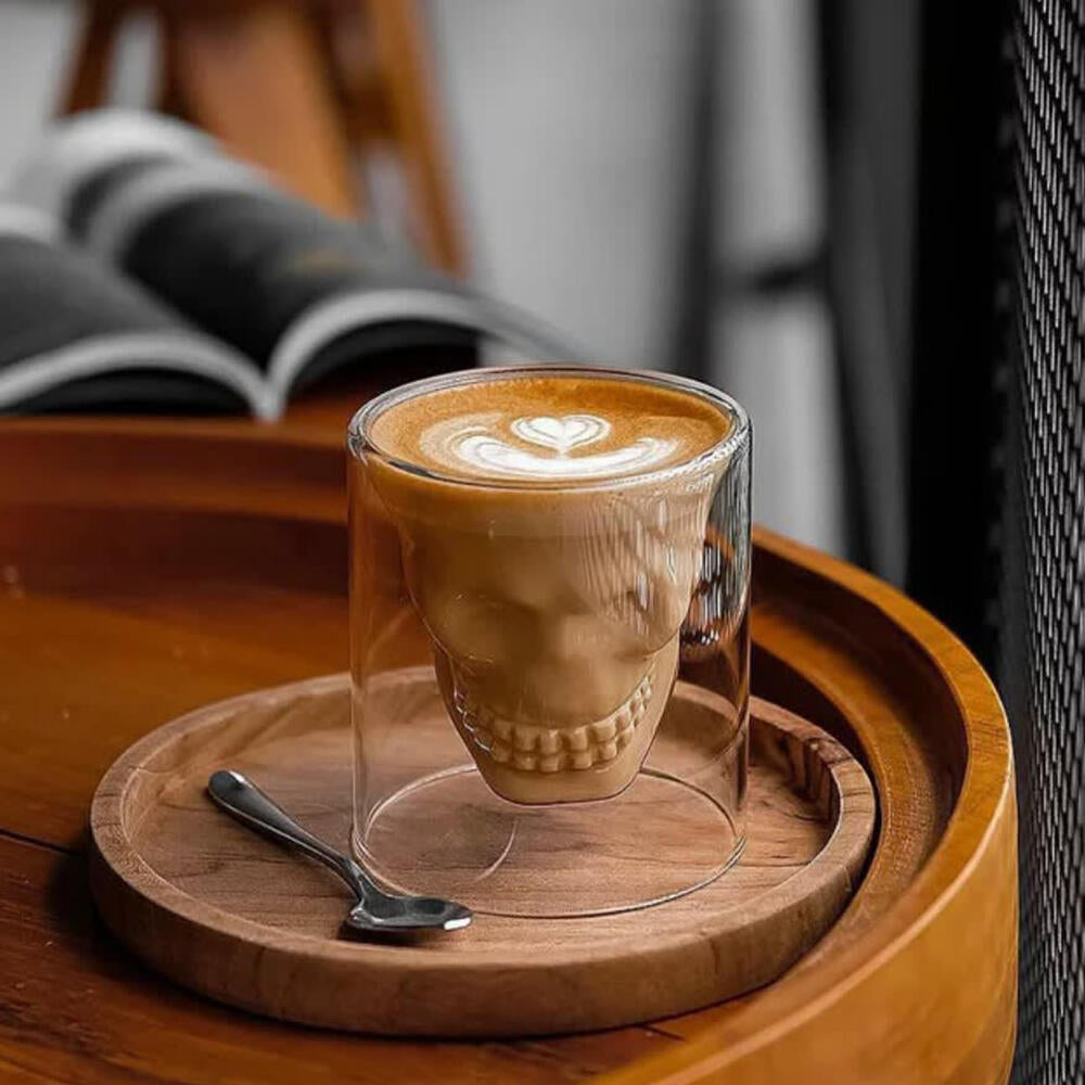 Material de vidrio de alta calidad, la vasos de calavera prensados duraderos se puede utilizar durante mucho tiempo. El fondo es estable y se puede colocar firmemente sobre la mesa.